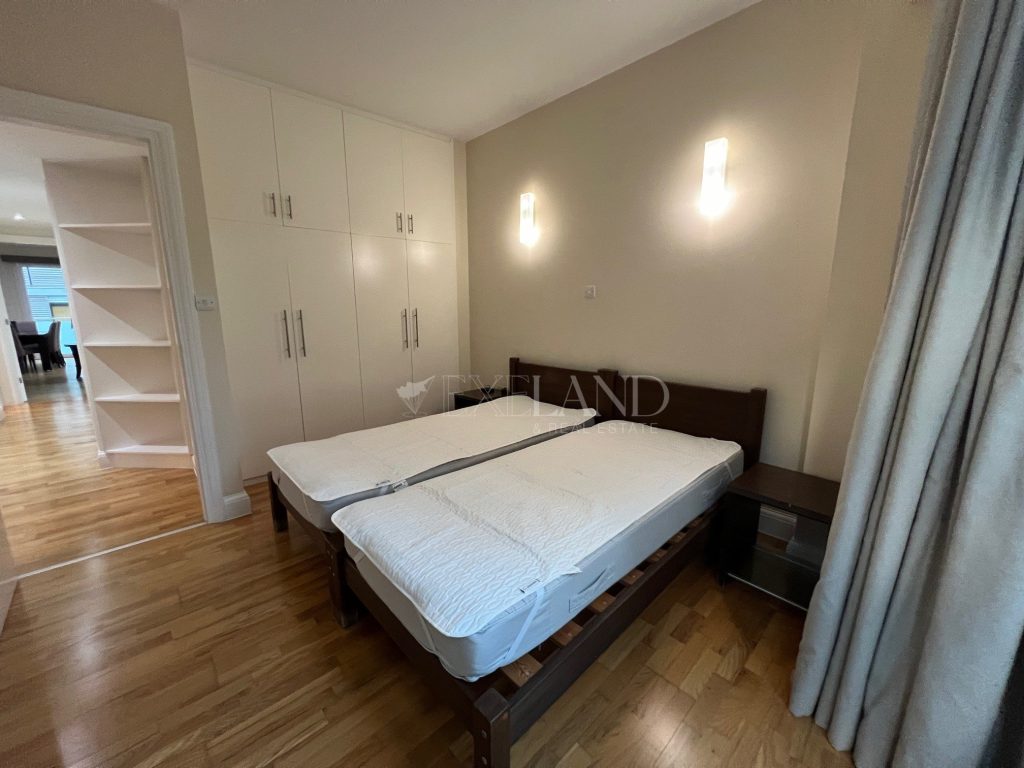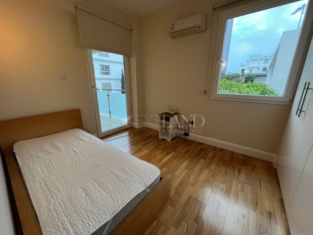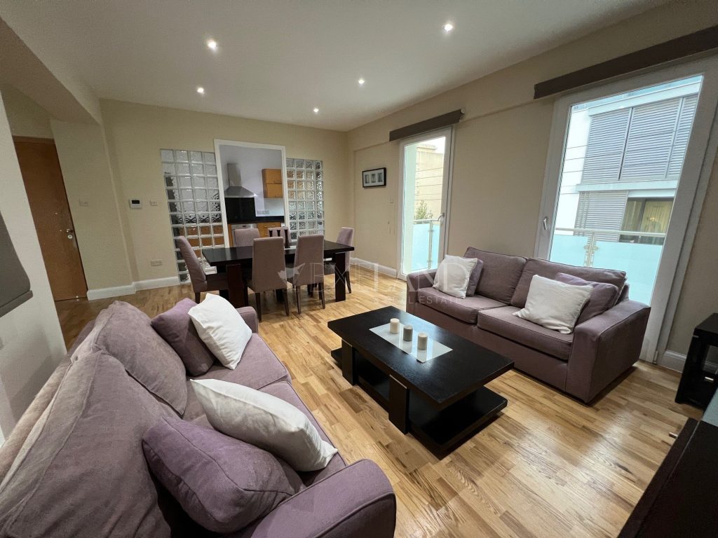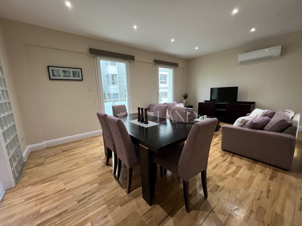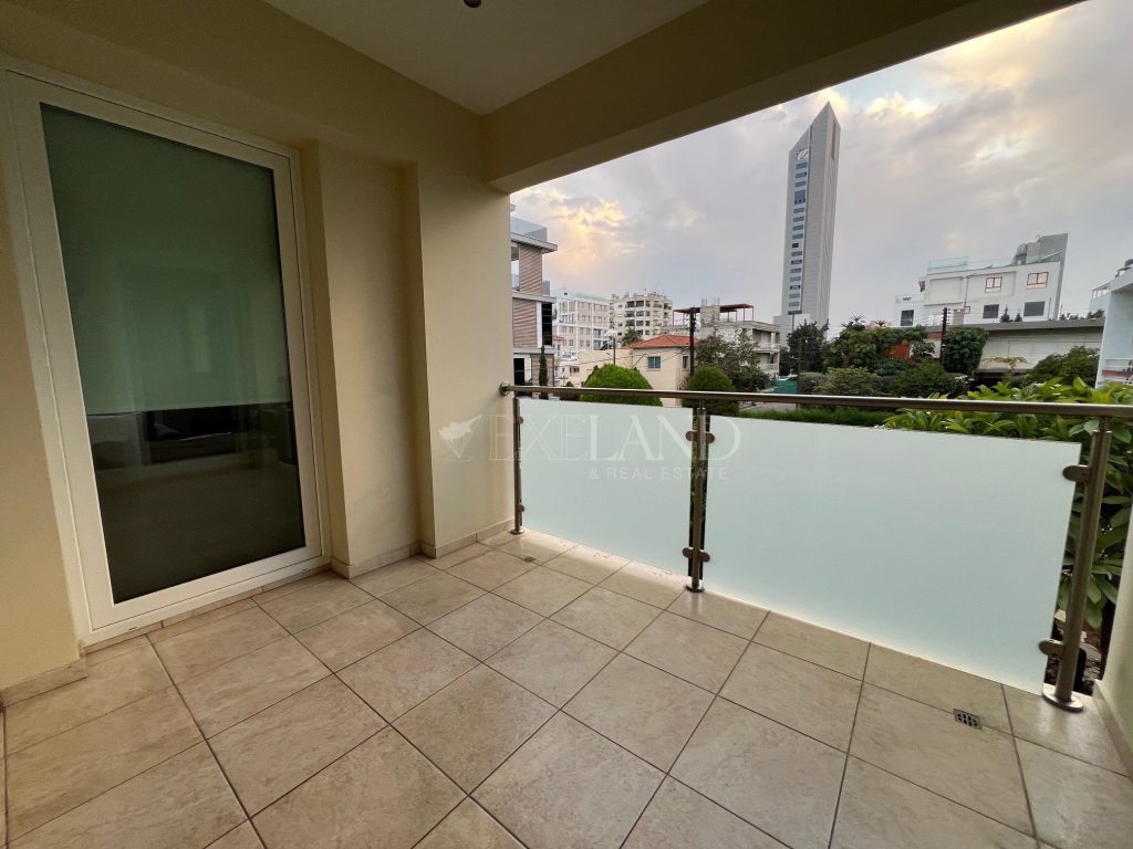 Spacious three-bedroom apartment with a city views located in the city center, close to Makariou Avenue and within walking distance to amenities. Internal area is 112 sq. m + 9 sq. m covered terrace and 5 sq. m uncovered balcony. it consists of an entrance area, separate kitchen, spacious living room with a dining area, three bedrooms (master bedroom en-suite with a shower) and family bathroom. It is available furnished and equipped, with air conditions, double-glazed windows with thermo and sound insulation, natural parquet, intercom system with camera, solar panels for hot water, underground parking and storage.