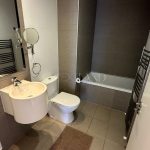 The layout includes a bright living area, a fully fitted kitchen with Miele appliances, two bedrooms and two full bathrooms. The master bedroom features an en-suite bathroom with shower and a walk-in wardrobe, while the second bathroom includes a bathtub. A separate laundry room is located next to the kitchen.
