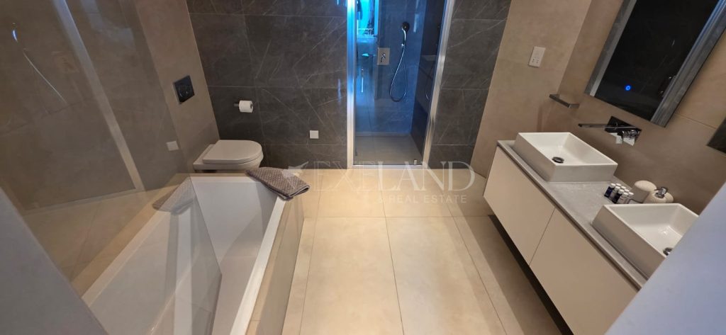 The apartment is delivered with high-quality finishes and includes fully installed kitchen appliances, smart home system, underfloor heating, as well as integrated heating and cooling systems throughout. Covered private parking is included.
