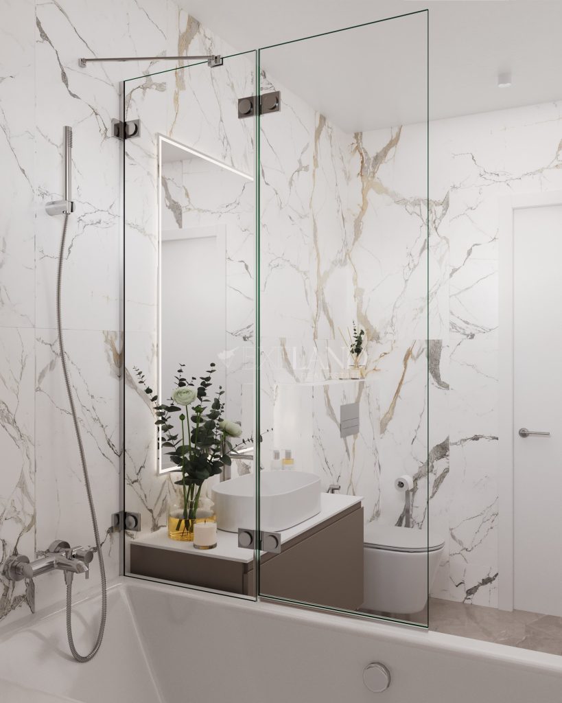 From the living room there is an access to a cozy veranda. The internal area is 87 sq.m and the covered veranda is 28 sq.m.
