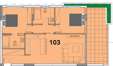 The apartment features an open-plan kitchen connected to the living and dining area, two bedrooms (one of which is en-suite with shower), and a main bathroom. The living room provides access to a cozy veranda.