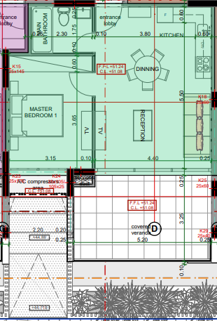 The apartment features an open-plan kitchen connected to the living and dining area, one bedroom and a main bathroom. The living room provides access to a spacious veranda.