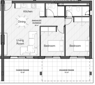 The covered internal area is 80 sq.m and the covered veranda is 15 sq.m.