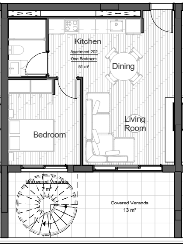 The apartment consists of an open-plan kitchen connected to the living and dining area, one bedroom and a main bathroom.