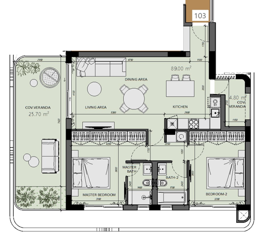 The apartment consists of an open-plan kitchen connected to the living and dining area, two bedrooms (one of which is a master bedroom with a shower), and a main bathroom.