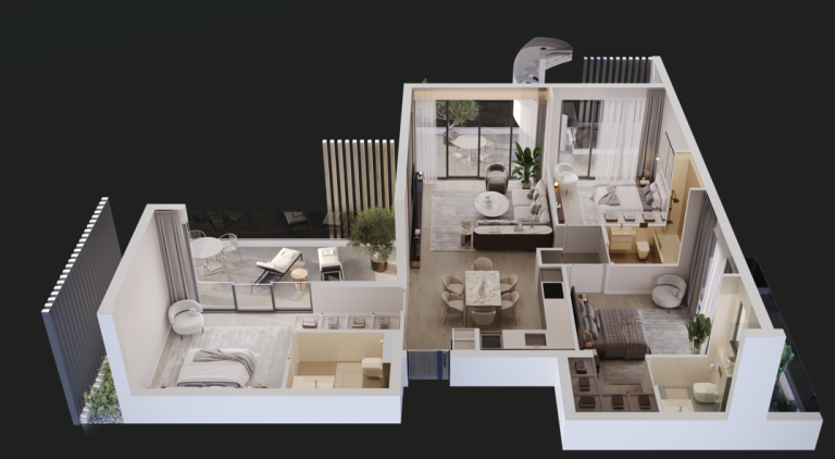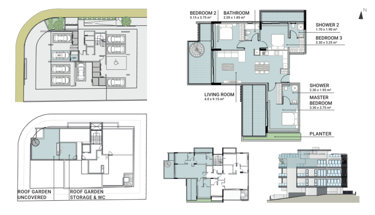 The apartment features an open-plan kitchen connected to the living and dining area, three bedrooms (two of which are en-suite with showers), and a main bathroom. The living room provides access to a spacious veranda and a roof garden with a BBQ area.