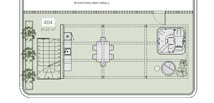 From the living room, there is access to a cozy veranda and roof garden with BBQ area and jacuzzi.