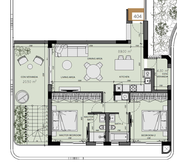 The apartment consists of an open-plan kitchen connected to the living and dining area, two bedrooms (one of which is a master bedroom with a shower), and a main bathroom.