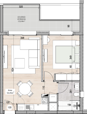 Из гостиной есть выход на уютную веранду. Площадь крытой части квартиры составляет 53 кв.м, а крытой веранды — 13 кв.м.
